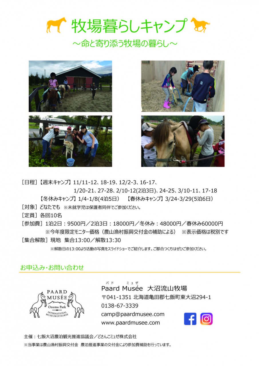 冬休み(1/4~8)牧場暮らしキャンプ、募集中♪ 【Paard Musée 大沼流山牧場】