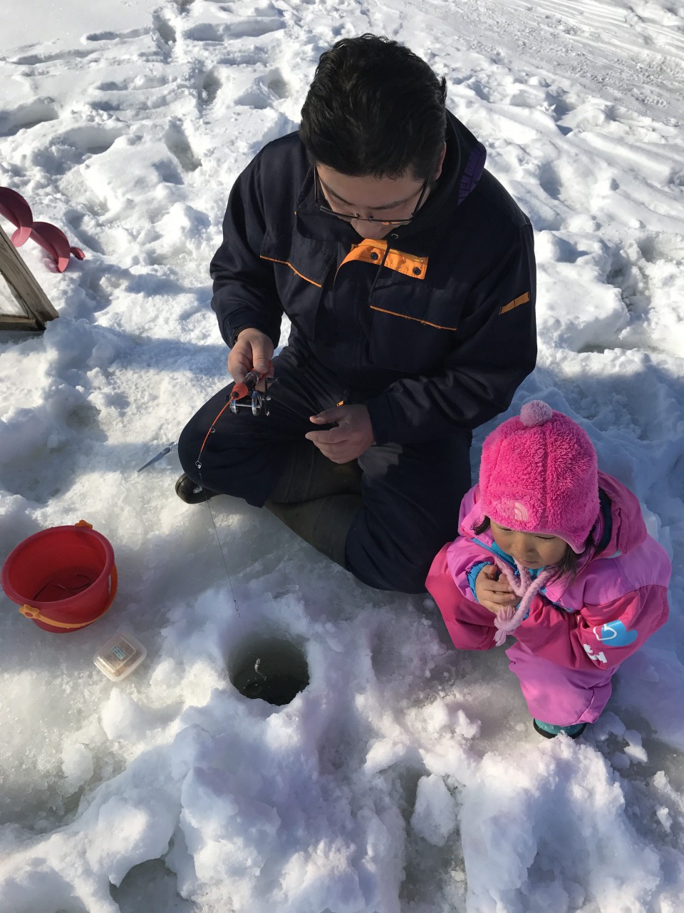 釣りながらホットワインや暖かい飲物でホッと一息。釣ったわかさぎはその場でてんぷらにしていただきます。
