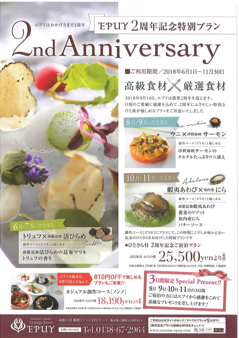 2018年6月19日 / 最終更新日時 : 2018年6月19日 ぐるっと大沼スタッフ お店の情報 オープン2周年記念特別プラン【大沼鶴雅オーベルジュ エプイ】 エプイでは今年2周年を迎えまして、2周年記念の宿泊プランを行っております。 【大沼鶴雅オーベルジュ エプイ】 FacebookXBlueskyHatenaCopy