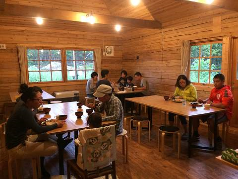 パドミュゼのログハウスに宿泊して、牧場暮らし体験。牧場のお仕事で汗を流したあとは、ゲストもスタッフもみんな一緒にご飯をいただきます。