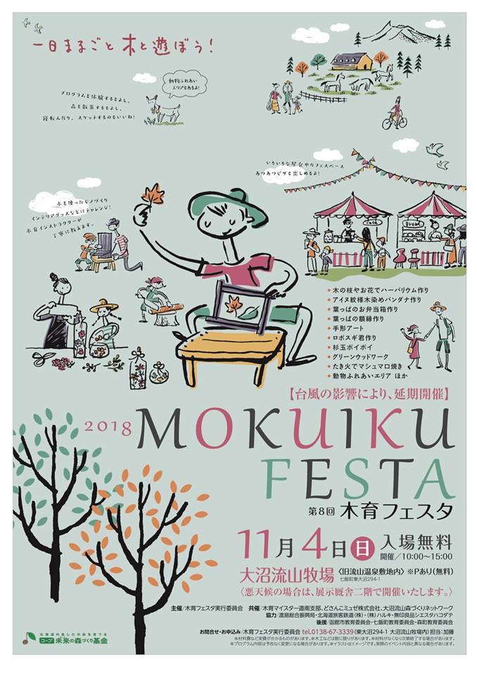 台風の影響で延期しておりました木育フェスタ、今週日曜日11/4に開催します。予報では好天で暖かそうです。
