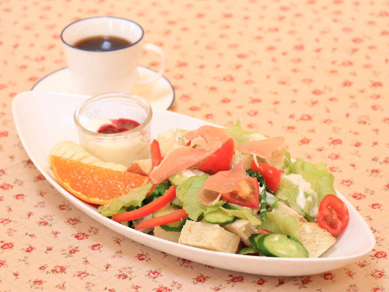 パンサラダセットは生ハムに鶏ハム、クリームチーズが野菜の間にごろごろ。