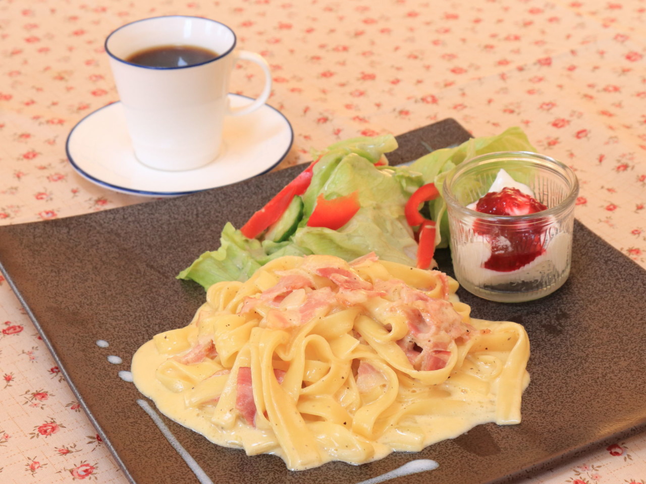 この日のパスタセットはカルボナーラ。 モッツァレラなど3種類のチーズとエーデルワイスの本格的なベーコンを使ったしっかりとした味わいに夫も大満足(*^^*)