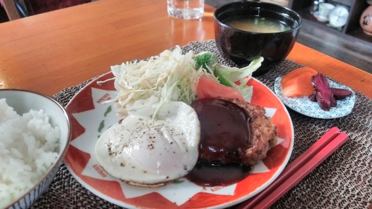 本日のワンコインランチは「ハンバーグ」。半熟たまごがのって、サラダもついて500円はお得♪