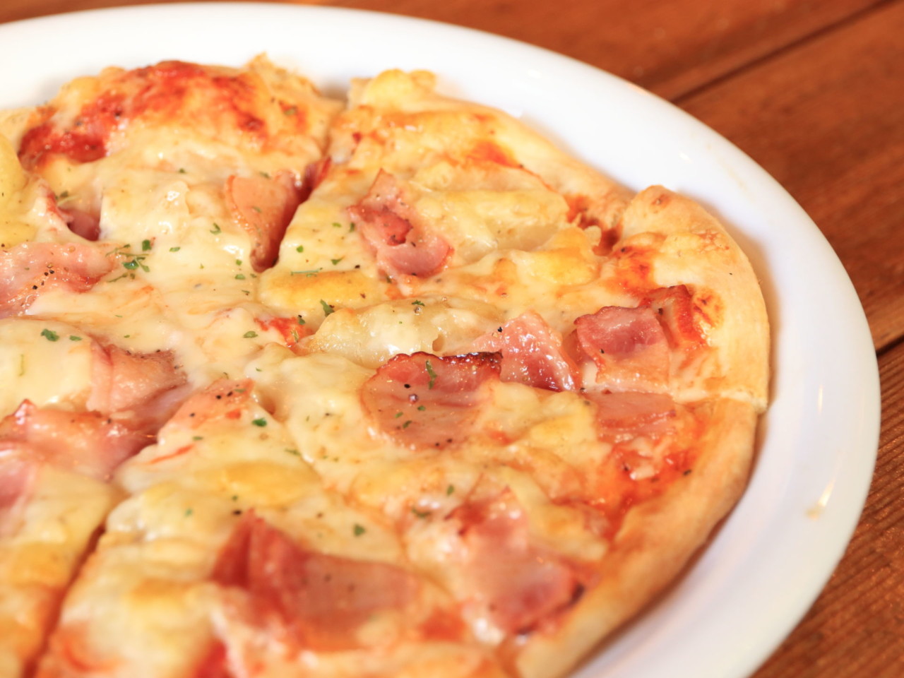 息子は迷った末に大好物のピザをチョイス。ジャーマンピザ1300円。