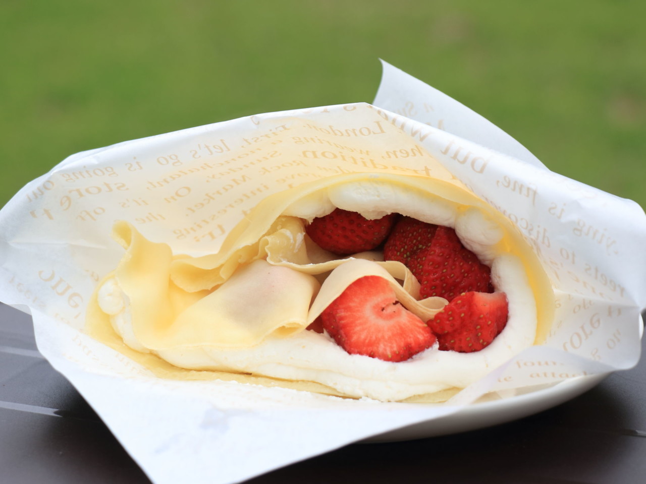 レタスやトマトに、クリームチーズ。そして厚切りのベーコンが入っていて、その塩気と旨味のハーモニーに思わずにっこり(*^-^*)けっこうボリュームもあるので、お食事としてもOKかもしれません。季節のクレープはイチゴのクレープ!そろそろイチゴが終わるので、まだ食べてな~い!という方、お急ぎくださいね♪