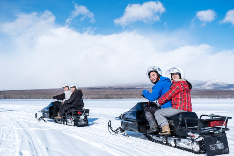全面結氷した大沼湖では、1周2,500mのロングコースを自分で運転するスノーモービル体験が人気。背後にそびえる 駒ヶ岳 を眺めながら、冷たい風を切って走る爽快感は格別です♪