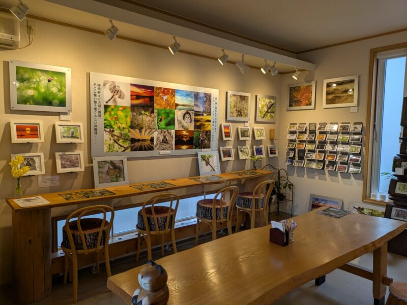 沼カフェOWLの魅力は、おいしい食事だけにとどまりません。店内には、ひとみママの夫である写真家・鎌田明宏さんが大沼国定公園で撮影した、四季折々の写真が展示されています。