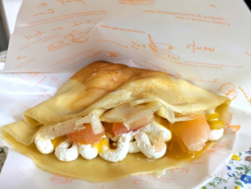 みずみずしい文旦の果肉がこれでもかというくらいふんだんに詰め込まれたこのクレープ。一口食べた瞬間に感動するのは、文旦の爽やかでほのかな苦味・生クリームのまろやかなコクと甘み、そしてマーマレードジャムの甘酸っぱさ、この三つが見事に溶け合ったハーモニー。それぞれが互いを引き立て合いながら、口の中でひとつの味をつくり上げていく——甘さ一辺倒ではない、その絶妙なバランスに思わず「おいしい」とつぶやいてしまいます。