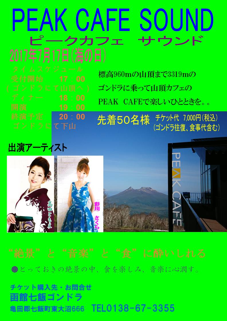 2017年6月27日 / 最終更新日時 : 2017年6月27日 ぐるっと大沼スタッフ お店の情報 7/17 PEAK CAFE SOUND イベント開催のお知らせ【函館七飯ゴンドラ】 来月7月17日 山頂のピークカフェにてイベントが開催されます。 夕日の沈む中、食事で楽しんでいただき、星空の下、歌でゆっくりした空間をお楽しみください。 【函館七飯ゴンドラ】 FacebookXBlueskyHatenaCopy